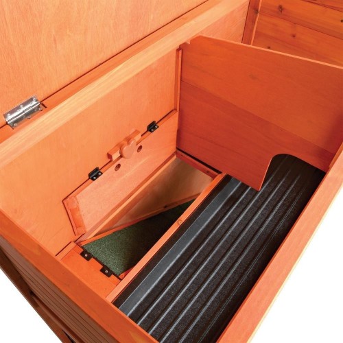 Zamykana klapa z plastikowym pokryciem Moze byc rozszerzona o wybieg natura Posiada kryjówke Dach pokryty papa Dach otwierany od góry Wysuwana plastikowa taca Solidne okratowanie druciane, malowane proszkowo Lakierowane drewno sosnowe