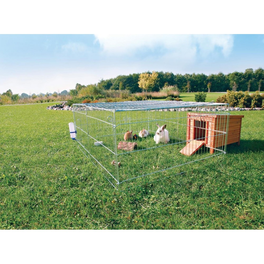1 drzwi w pokrywie górnej, 1 duze drzwi boczne 2 drzwi wahadlowe do przylaczenia domku dla malych zwierząt natura Zawiera kotwy montazowe Metalowy, ocynkowany