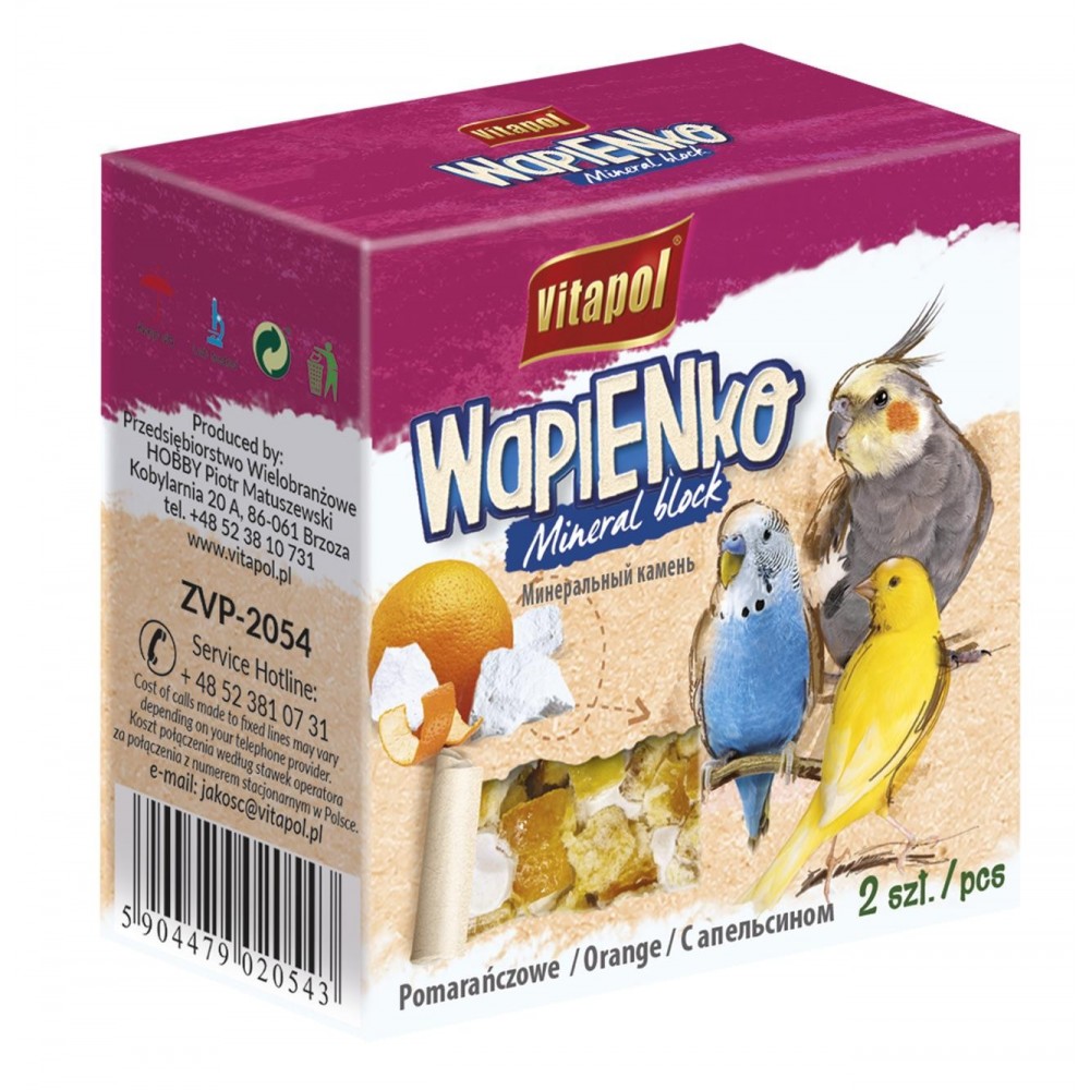 Niezastąpiony suplement ptasiej diety. Wapno jest podstawowym składnikiem budulcowym kośćca, niedobór prowadzi do niedorozwoju i krzywizny, a u starszych ptaków do osłabienia kości i ich łamliwości. Wapń jest również niezbędny do budowy skorupek ptasich jaj w trakcie lęgów oraz w okresie pierzenia. Wapienko zostało dodatkowo wzbogacone pomarańczom, co czyni ją bardziej atrakcyjną i smakowitą.
