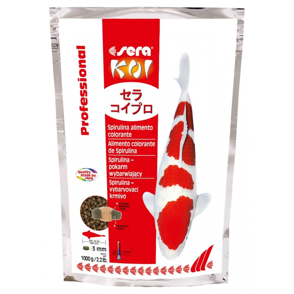 KOI Professional Spirulina Color Food – zawiera szczególnie dużą ilość bogatej w karoten spiruliny i alg Haematococcus, które zapewniają wyjątkową głębię koloru, wyraźne rozgraniczenie stref kolorów i jedwabisty połysk. Białe wzory nie stają się brzydkie, żółte ale pozostają jasne, białe. Wysokiej jakości białko zapewnia równomierny i zdrowy wzrost.