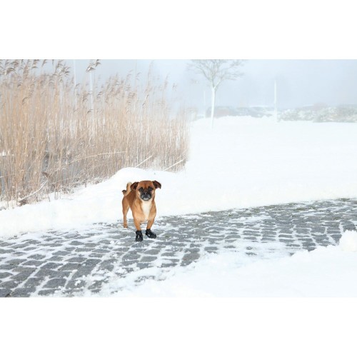 Wytrzymala podeszwa zapewniajaca przyczepnosc (PVC) Oddychajacy material Komfortowe do noszenia Trwale specjalna ochrona na kamieniste lub gorace podloze Chronia przed zwirem i sola w zimie Z paskami odblaskowymi Z rzepami Z dwoma paskami na rzep w rozmiarach XS–S Kolor: czarny
