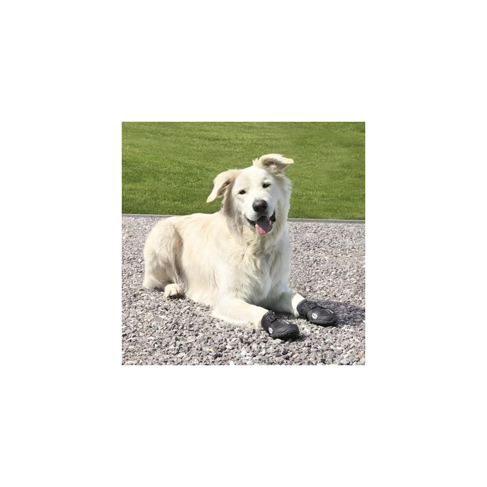 Wytrzymala podeszwa zapewniajaca przyczepnosc (PVC) Oddychajacy material Komfortowe do noszenia Trwale specjalna ochrona na kamieniste lub gorace podloze Chronia przed zwirem i sola w zimie Z paskami odblaskowymi Z rzepami Z dwoma paskami na rzep w rozmiarach XS–S Kolor: czarny